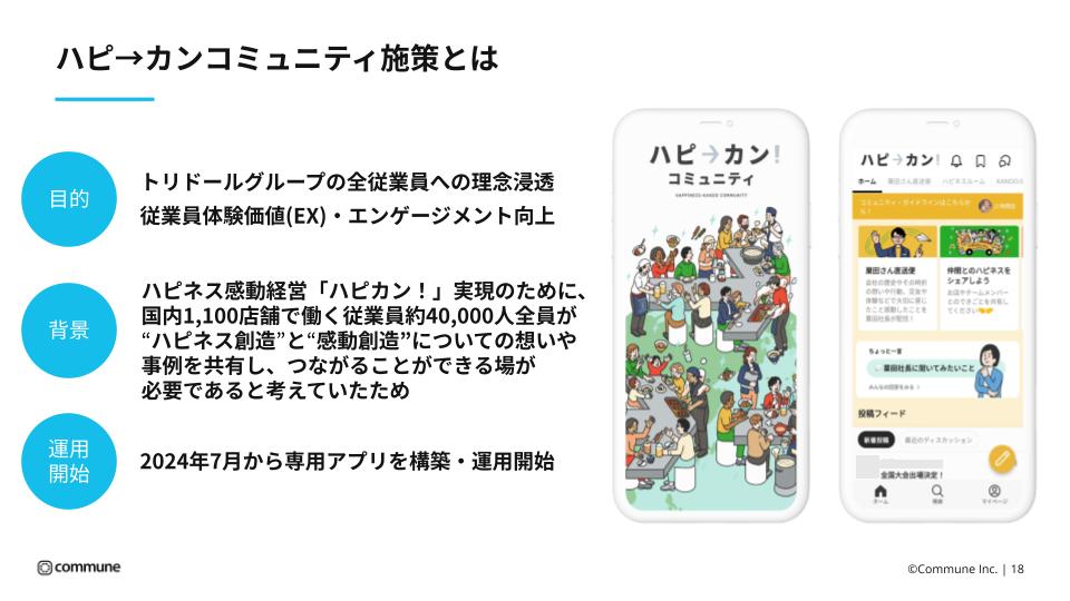 2024年7月、トリドール様は当社の「Commune for Work」を活用し、全従業員を対象とした社内SNS「ハピ→カン!コミュニティ」を正式に立ち上げました。対象は、正社員・パート・アルバイトを含む約4万2,000名。全国1,100を超える店舗をつなぎ、理念「ハピネス感動経営(ハピカン)」を体感的に浸透させるための“心のインフラ”として機能しています。