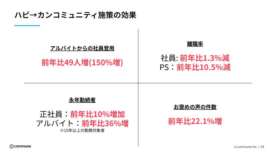「アルバイトから社員に登用された方が前年比で150%増えました。これは“自分の働く会社が好きになれたから、もっと貢献したい”という意識変化の結果だと思います。さらに、社員の離職率は1.3ポイント、パート・アルバイトは10ポイント以上改善しました」
