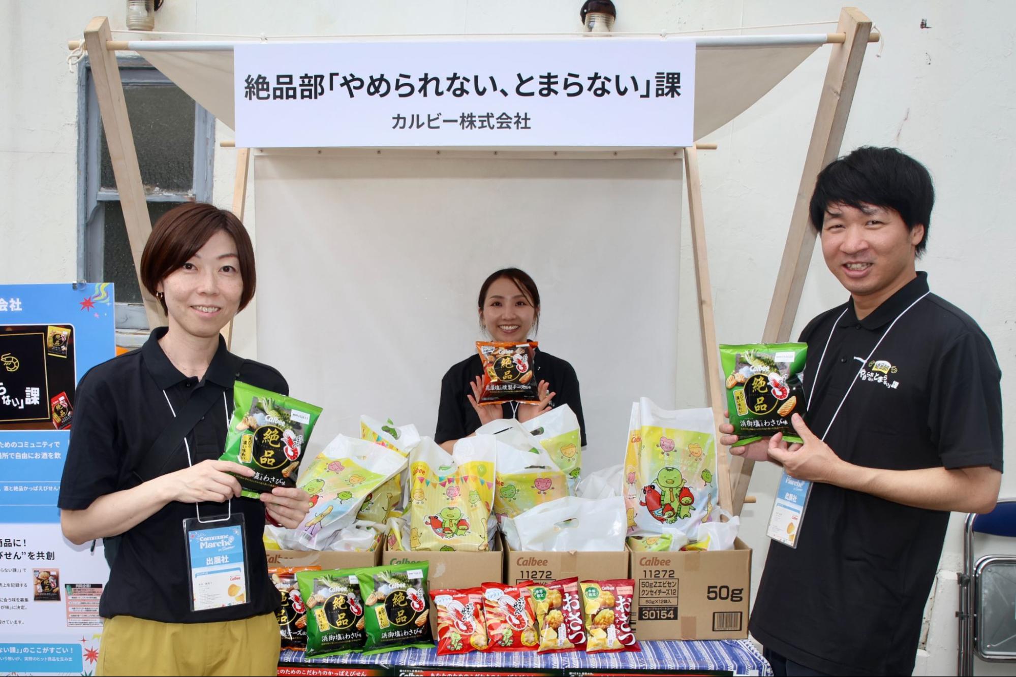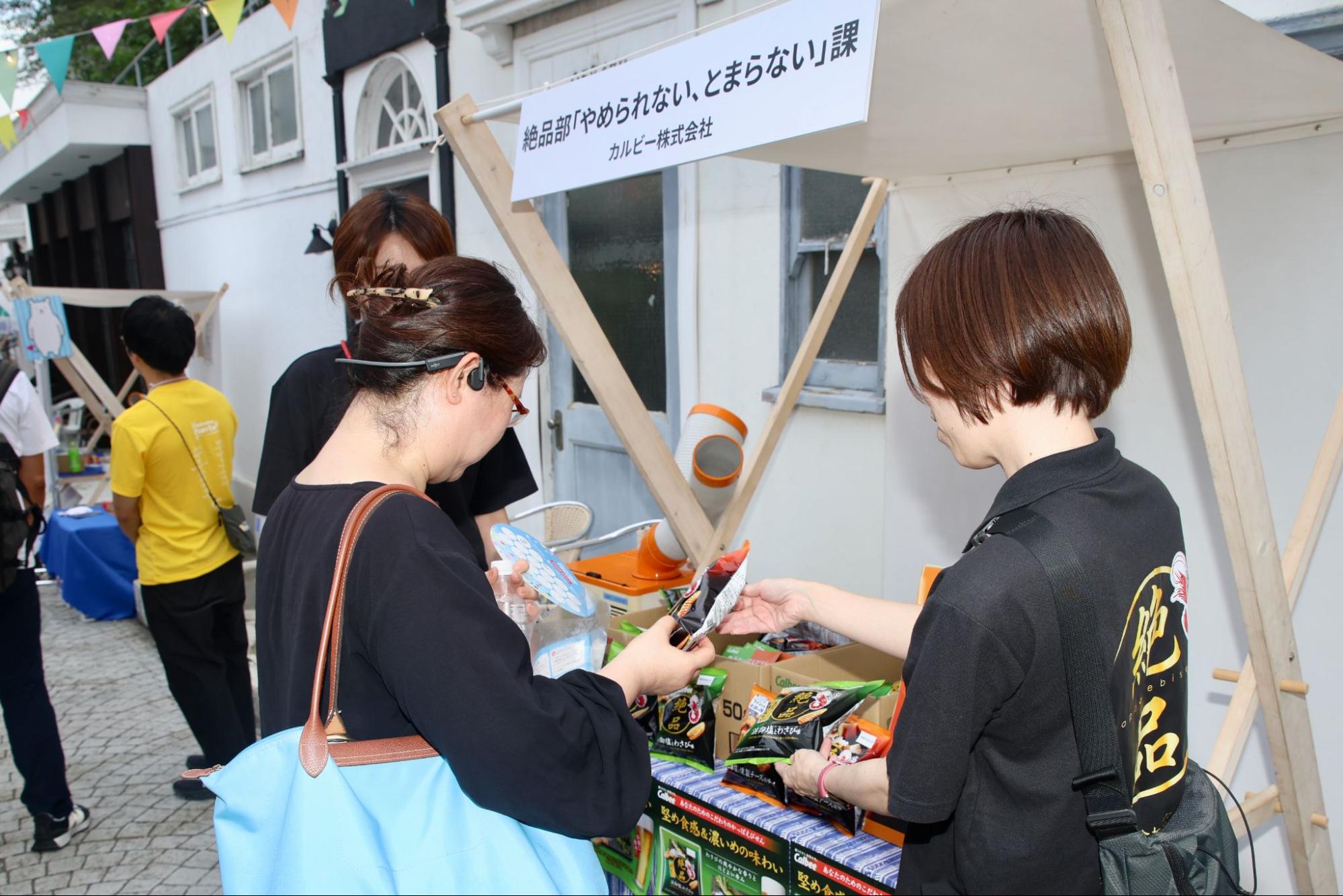 お酒と一緒に楽しむ“絶品かっぱえびせん”をテーマに集うカルビーのファンコミュニティ「絶品部 「やめられない、とまらない」課」。ブースでは、新商品の「絶品かっぱえびせん 花藻塩と燻製チーズ風味」などの商品がサンプリングとして提供され、来場者からは「本当にお酒に合いそう!」と笑顔があふれました。