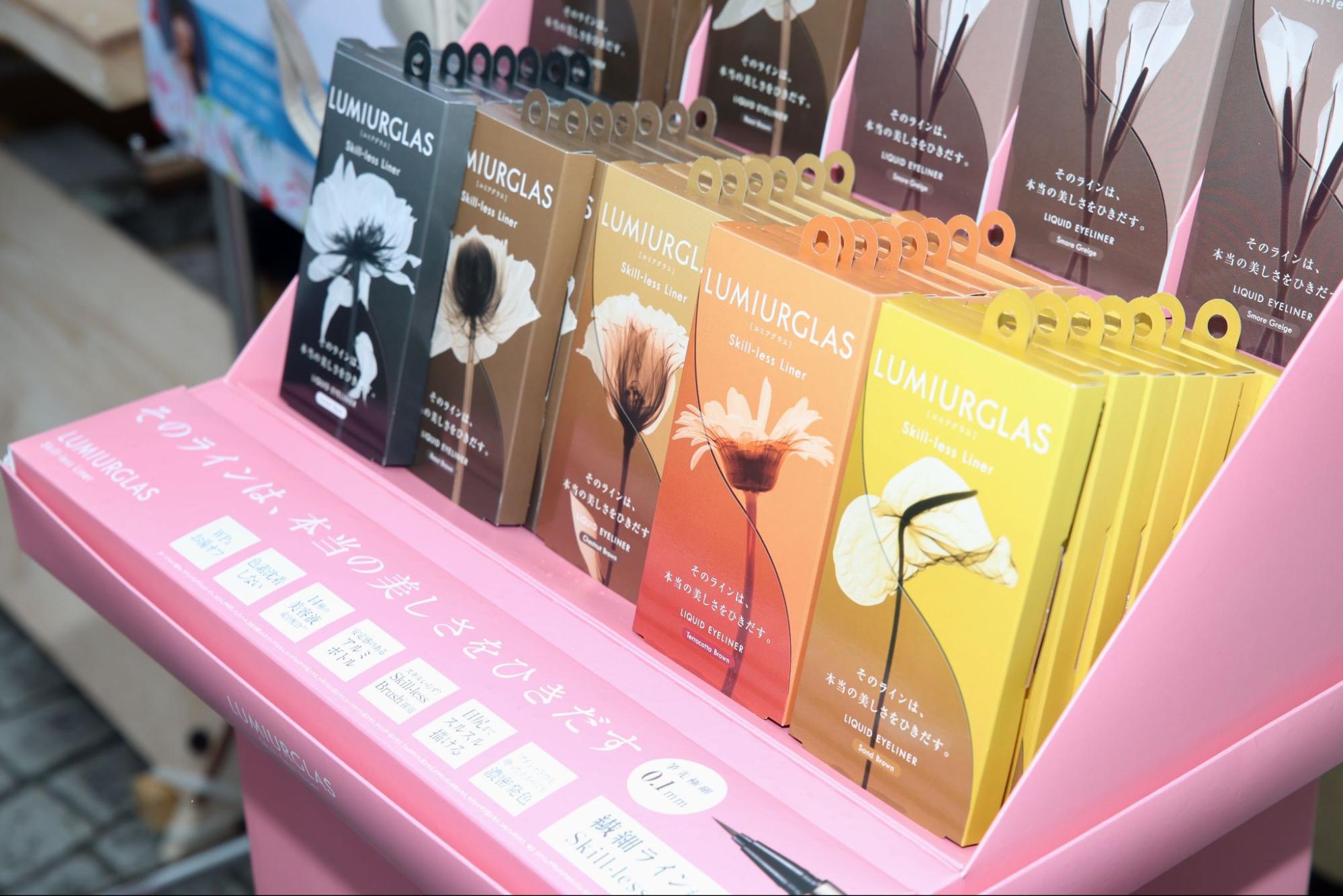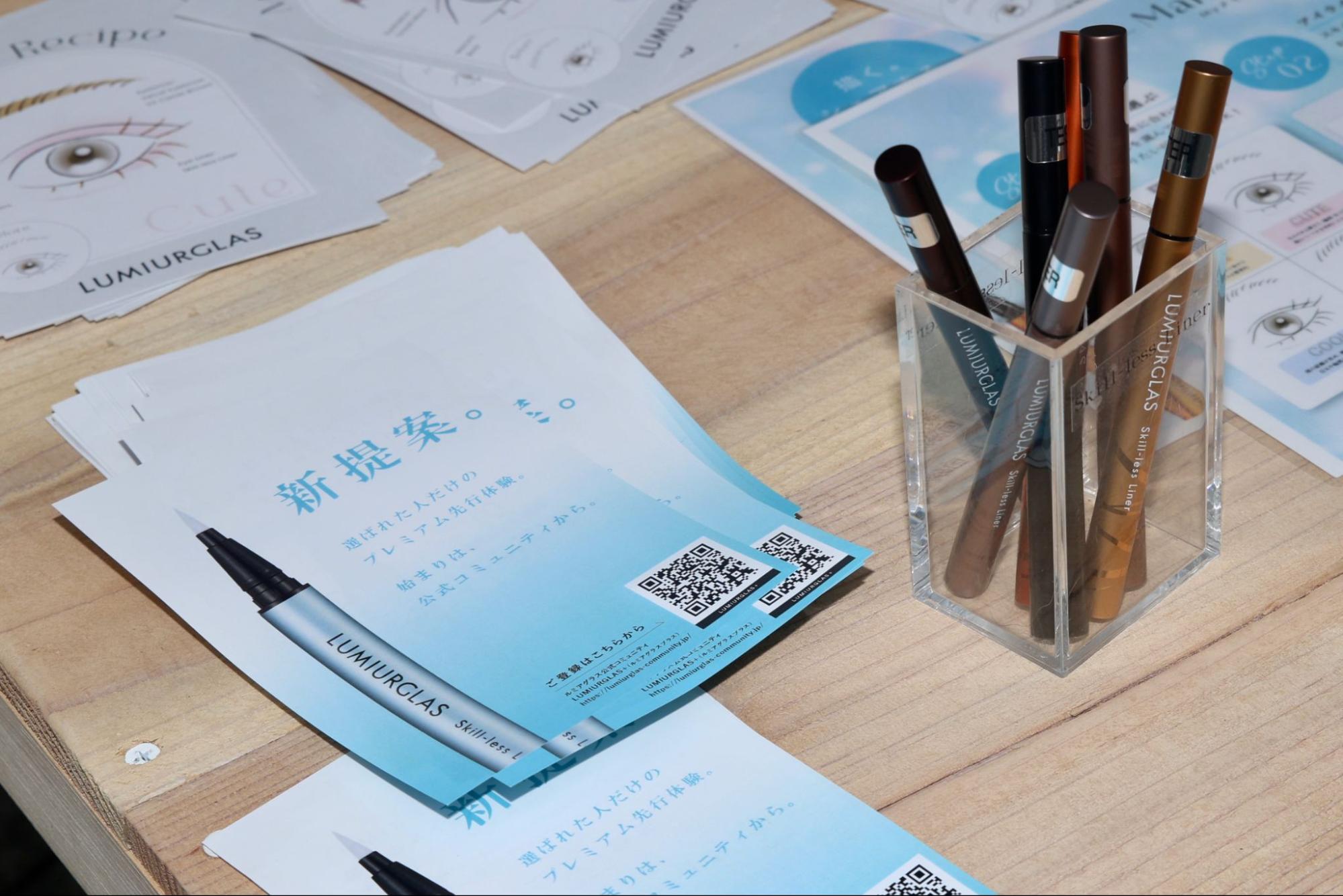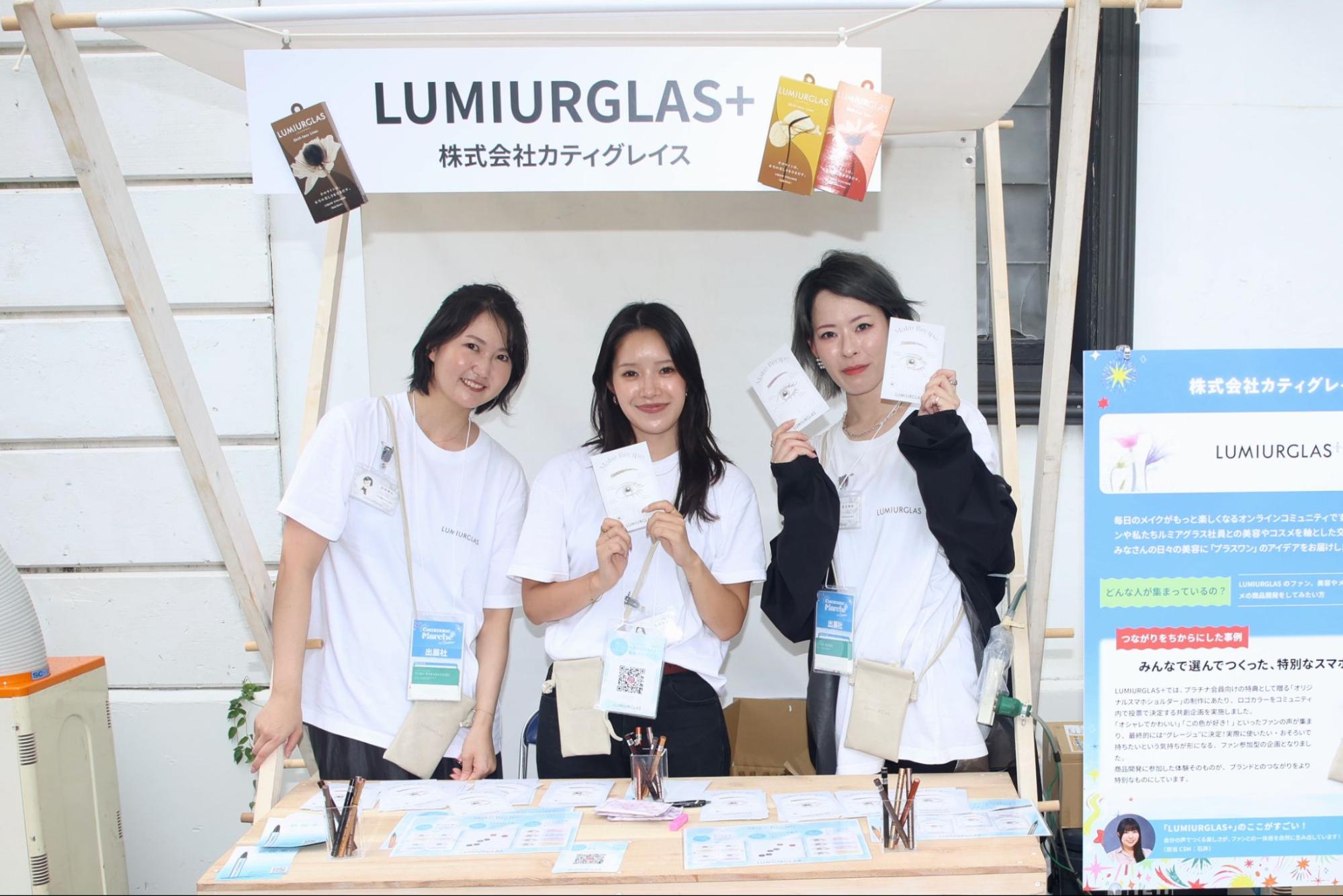 全国のLUMIURGLASファンやカティグレイス社員が美容・コスメを軸に交流する「LUMIURGLAS+」。ブースでは、コミュニティ内でファン投票によって選ばれたオリジナルスマホショルダーが紹介されていました。また、スキルレスライナーの試し書きができるなど、商品の魅力を感じる体験が行われていました。