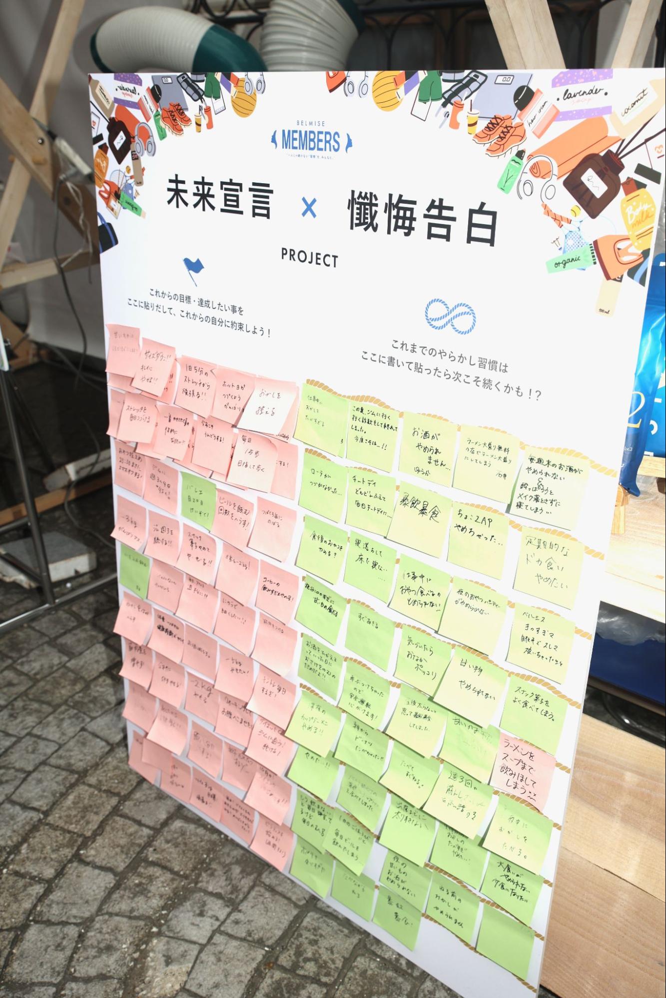 「一人じゃなかなか続かない美容習慣を、みんなで一緒に」をテーマにした公式コミュニティ「BELMISE MEMBERS」。ブースでは、着圧レギンスを手にした来場者が「これなら続けられそう」と笑顔を見せていました。会場では、「未来宣言×懺悔告白」を付箋に書いて貼るイベントを実施。美容習慣を続けたい思いを応援する展示となっていました。