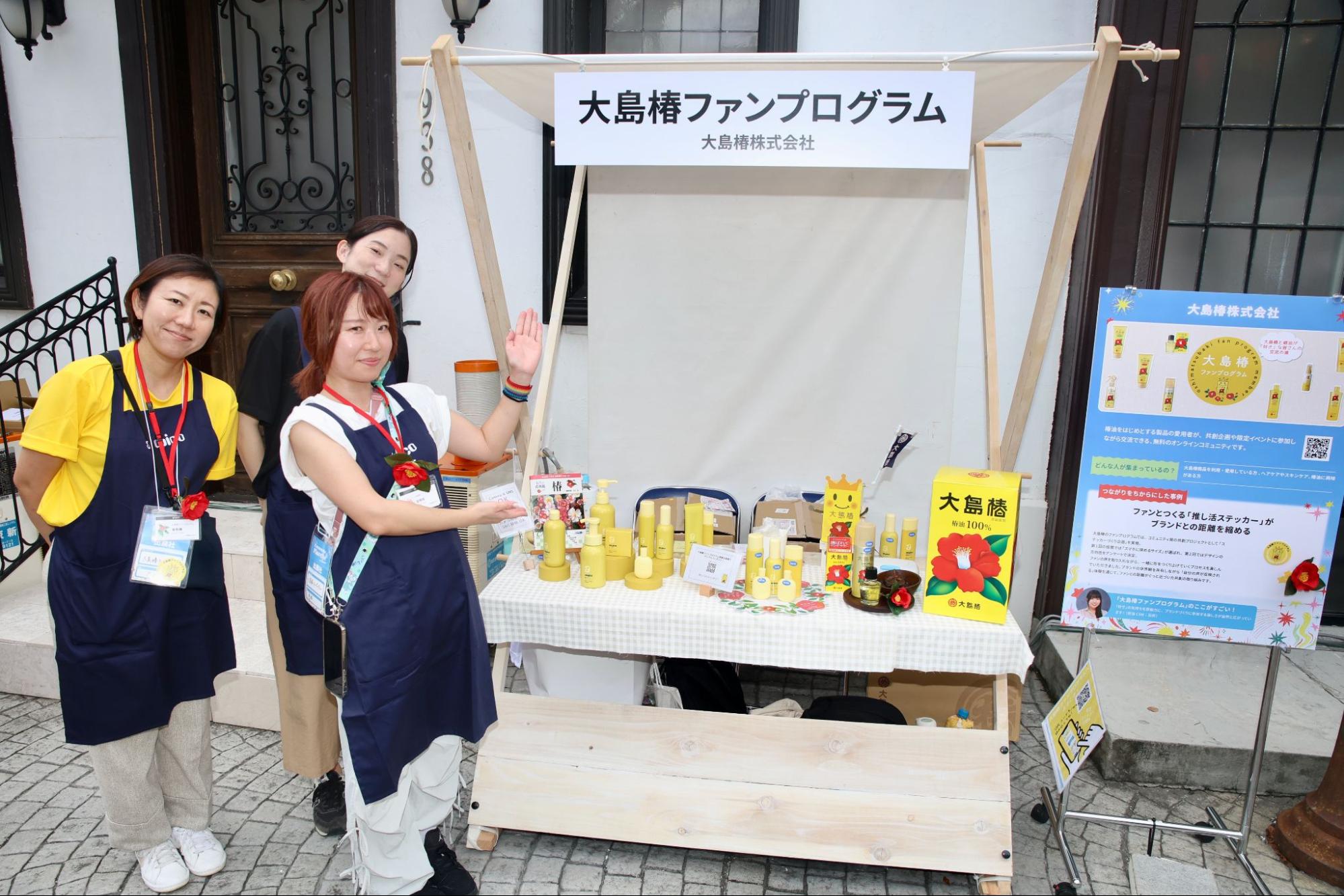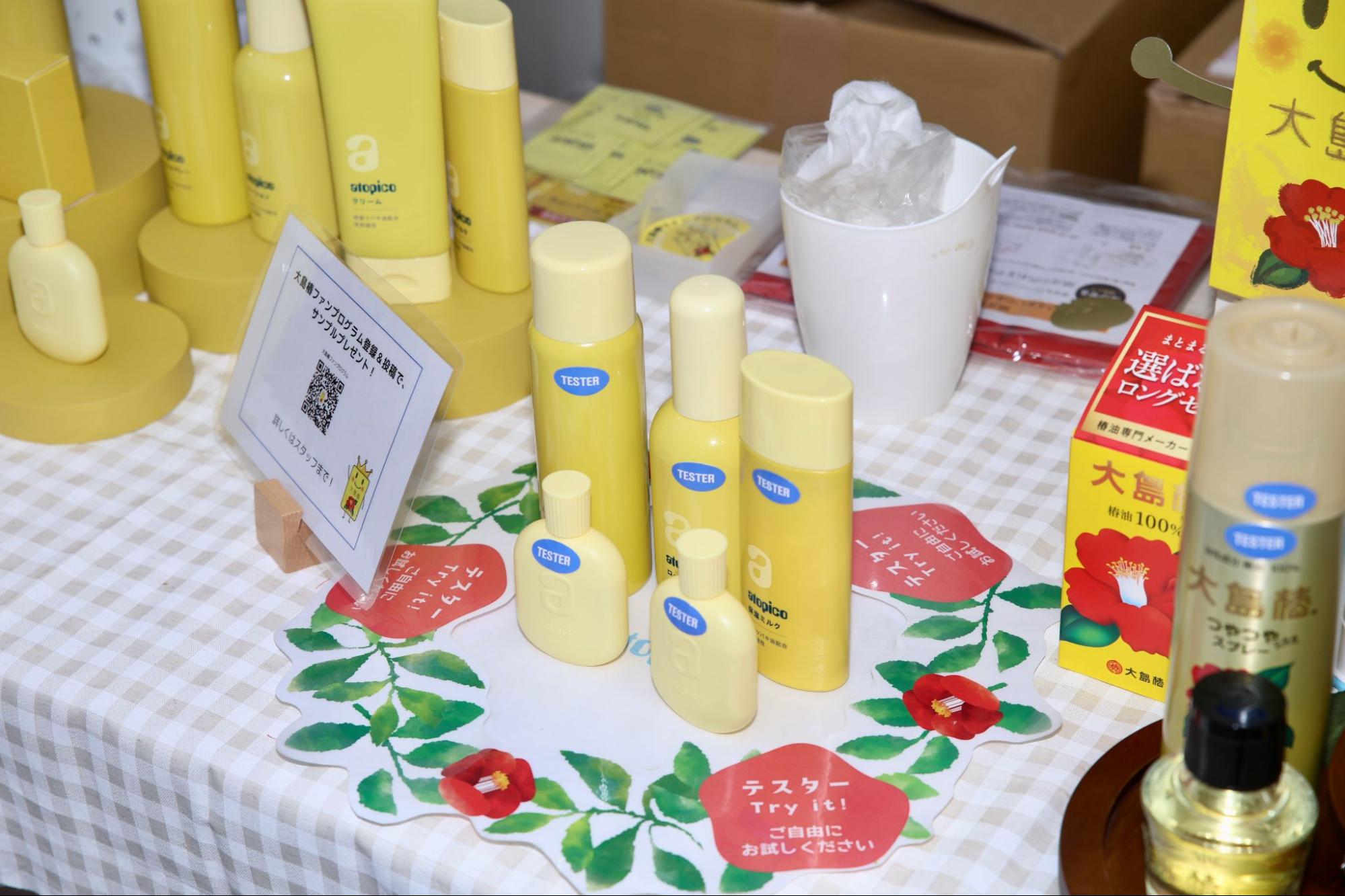椿油をはじめとする大島椿製品の愛用者が集うオンラインコミュニティ「大島椿ファンプログラム」。ブースでは、リニューアルされた「アトピコ」シリーズのテスター体験が行われ、来場者が実際に使用感を確かめながらスタッフと会話を弾ませていました。