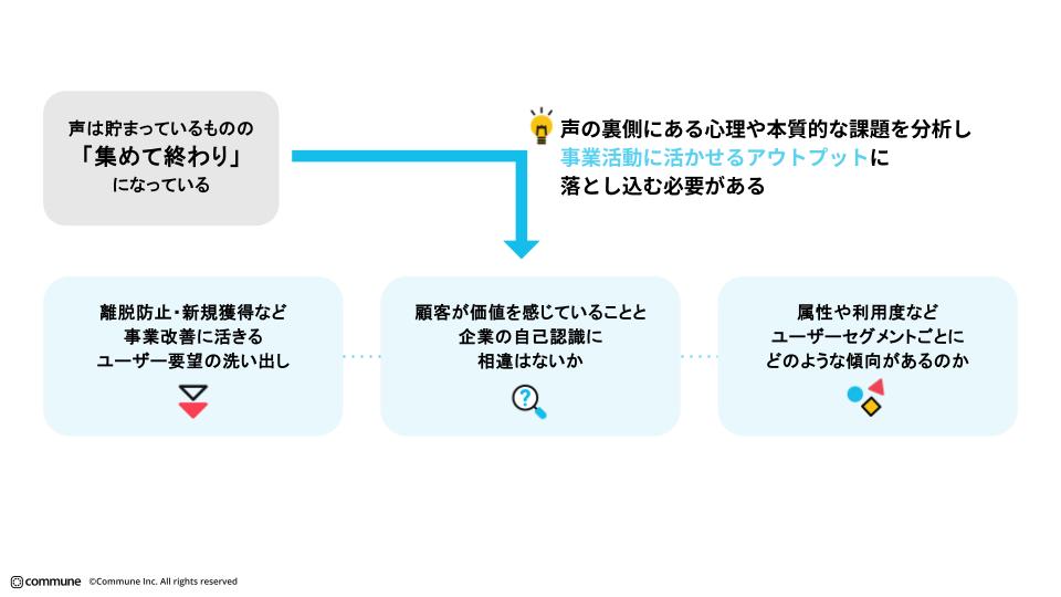 われわれが企業から求められるのは、単に「どんな声が多いのか」「ポジティブかネガティブか」を可視化することではありません。その分析が事業成果につながるかどうかです。