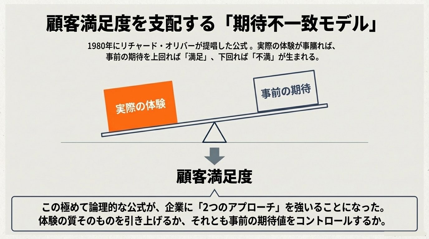 顧客満足度の研究を遡ると、ある有名な公式に行き着きます。消費者行動研究者のリチャード・オリバーが1980年に発表した「期待不一致モデル(Expectancy-Disconfirmation Model)」です。その核心をひとことで言えば、「満足度は、実際の体験から事前の期待を引いた差分によって決まる」ということです。体験が期待を上回れば満足が生まれ、下回れば不満が生まれる。シンプルで、直感的で、反論しにくい公式です。