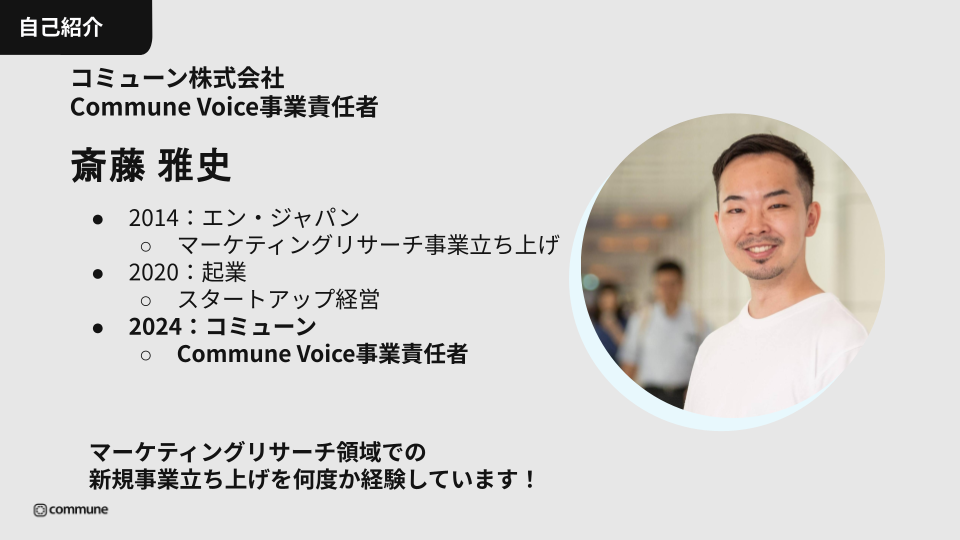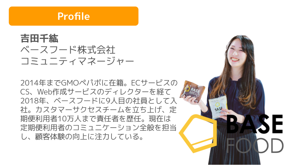 コミューン株式会社 斎藤 雅史(以下、斎藤):本日は、ベースフード様が運営するファンコミュニティの実態と、コミュニティ内VoC(Voice of Customer:商品やサービスに対する顧客の声)を活用した顧客理解についてお話いただきます。