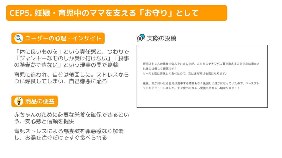 斎藤:例えば、『妊娠・育児中のママを支える「お守り」として』というCEP。ユーザーインサイトからは、妊娠中は「体に良いものと食べなければならない」という責任感と「つわりでジャンキーなものしか受け付けない」「食事の準備ができない」との間で葛藤している様子が、産後は「育児に追われ、つい自分のケアが後回しになってしまう」「ストレスから爆食してしまう」という自己嫌悪が見られました。