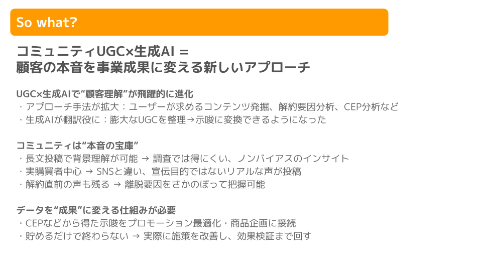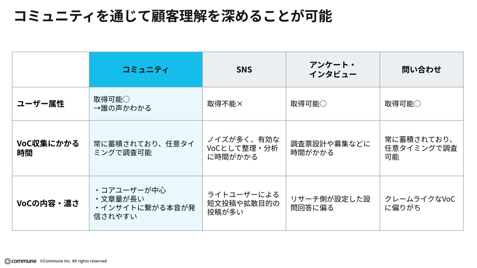 斎藤:これまで、VoCを活用して消費者のインサイトを分析するためには、SNSやアンケート、インタビュー、お問い合わせデータを用いることが一般的でした。対して、コミュニティ内のVoCを分析するメリットとしては、