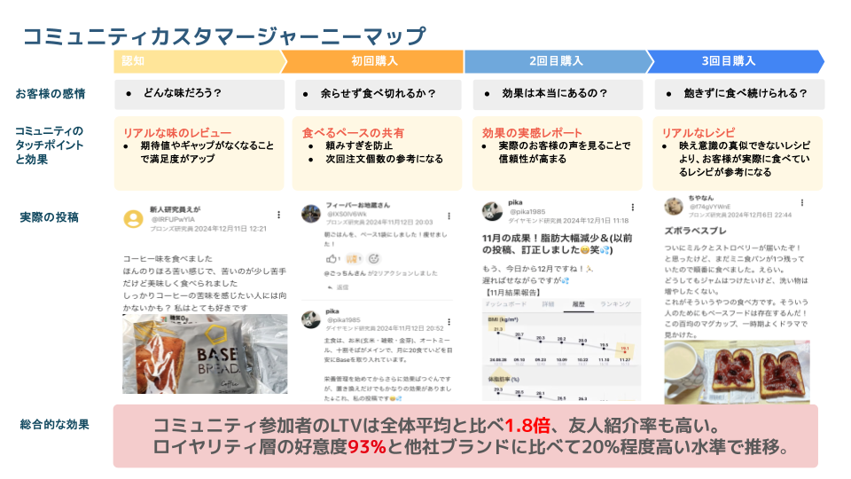 吉田:以下はBASE FOODのカスタマージャーニーマップです。お客様はフェーズごとに、継続の意思決定に必要な情報を得ることができるため、コミュニティ参加者のLTVは全体平均と比べ1.8倍となっており、友人紹介率も高くなっております。ロイヤリティ層の好意度も93%と、他社ブランドに比べて20%程度高い水準で推移しています。