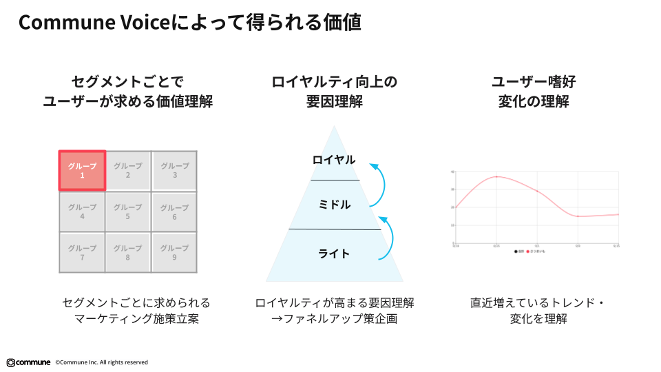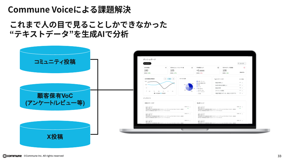斎藤:ありがとうございます。そうしたコミュニティ内の膨大な声を「集める」に留まらず、深い「顧客理解」に繋げることを実現するのがCommune Voiceです。