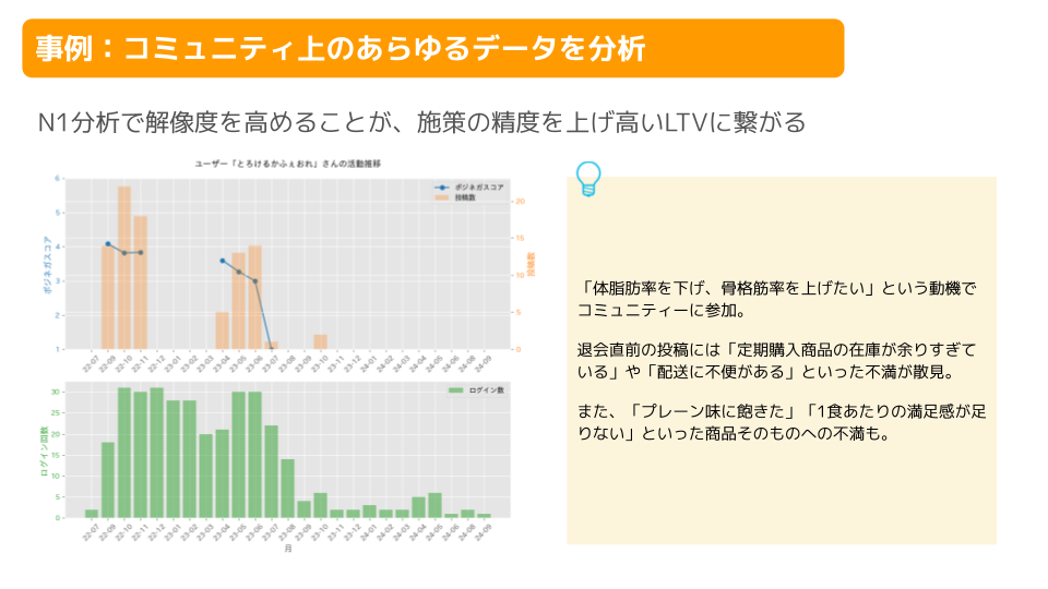 これまでのコミュニティの課題として、たくさんのインサイトが集まるものの、分析しようとするとどうしても目視がメインになってしまい、声を分類したり、どのような声がどんなタイミングで増えているのかなどを定量化し、客観的に傾向やインサイトを分析するのが難しい、ということが挙げられました。