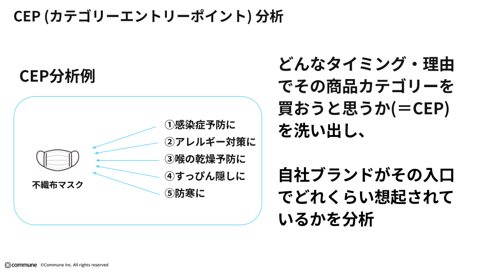 一つの商品でも、購入される理由や文脈は多岐にわたります。例えば「不織布マスク」ですと、「感染症予防に」「喉の乾燥対策に」「すっぴん隠しに」などがあたります。その文脈を明らかにしていくのがCEP分析で、CEPごとにマーケティング施策を打つことで、効果的な施策の実現に繋がります。